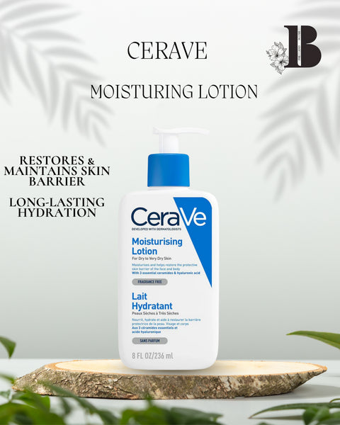 CeraVe Moisturizing Lotion 236ml: A lightweight, oil-free lotion that provides 24-hour hydration, enriched with ceramides and hyaluronic acid to help restore and protect the skin barrier.