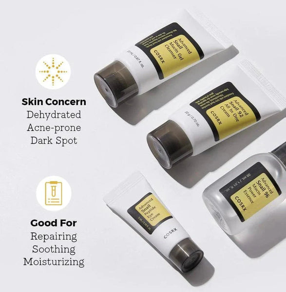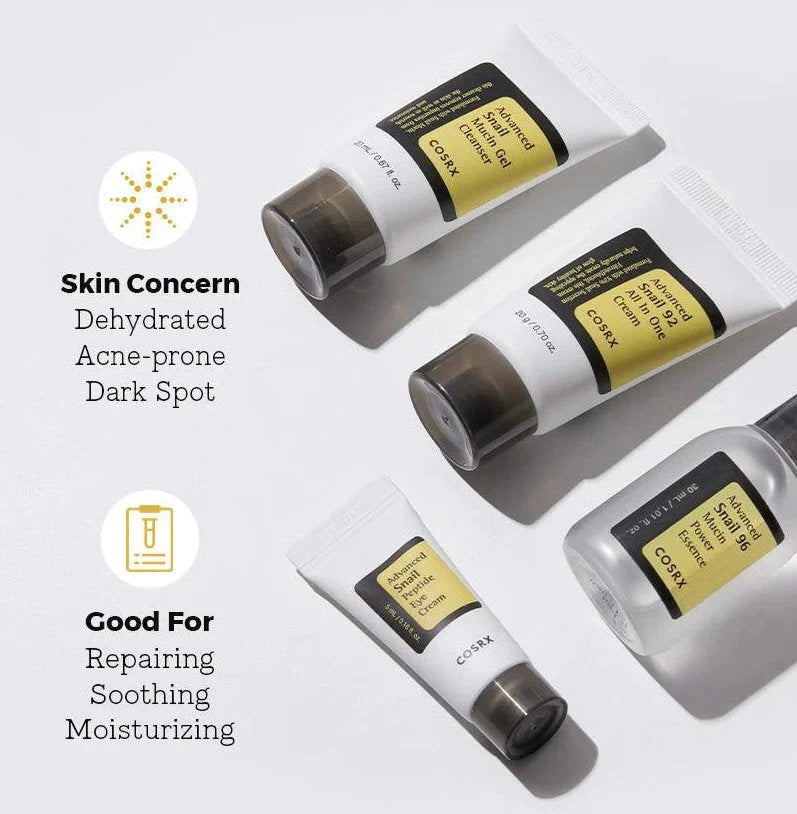 Experience the power of snail mucin with the COSRX All About Snail Kit, a complete skincare set designed to hydrate, repair, and rejuvenate your skin. Infused with 96% Snail Secretion Filtrate, this kit helps restore skin elasticity, fade acne scars, and strengthen the skin barrier for a healthier, glowing complexion. Perfect for both beginners and snail mucin lovers, this set delivers multi-step care for radiant results.