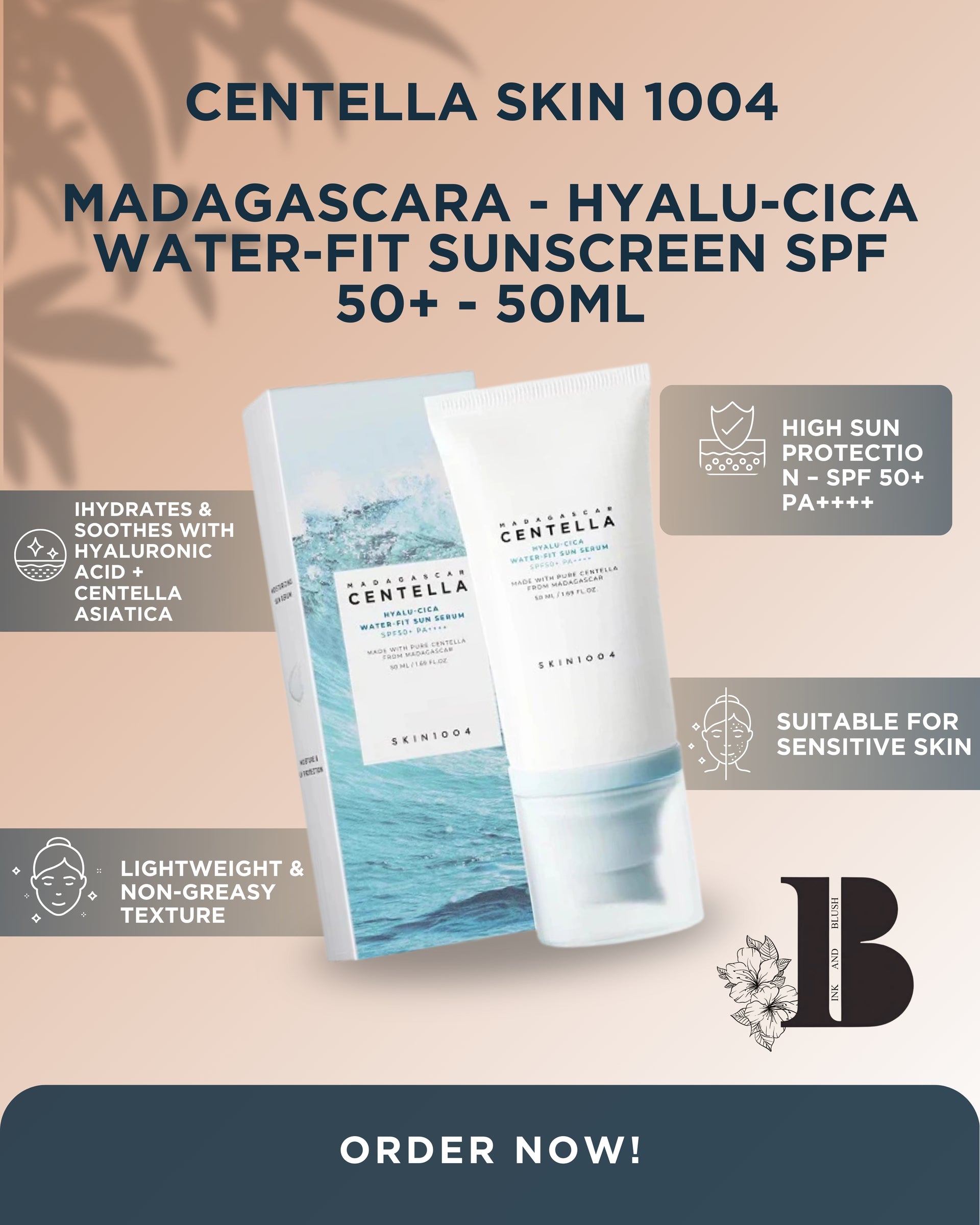 Protect and hydrate your skin with SKIN1004 Madagascar Hyalu-Cica Water-Fit Sunscreen. This lightweight, non-greasy sunscreen combines Hyaluronic Acid for deep hydration and Centella Asiatica extract for soothing care. With broad-spectrum SPF50+ PA++++, it defends against harmful UV rays while keeping skin calm, refreshed, and moisturized. The water-fit texture absorbs quickly, leaving no white cast—perfect for daily wear on all skin types, even sensitive skin.
