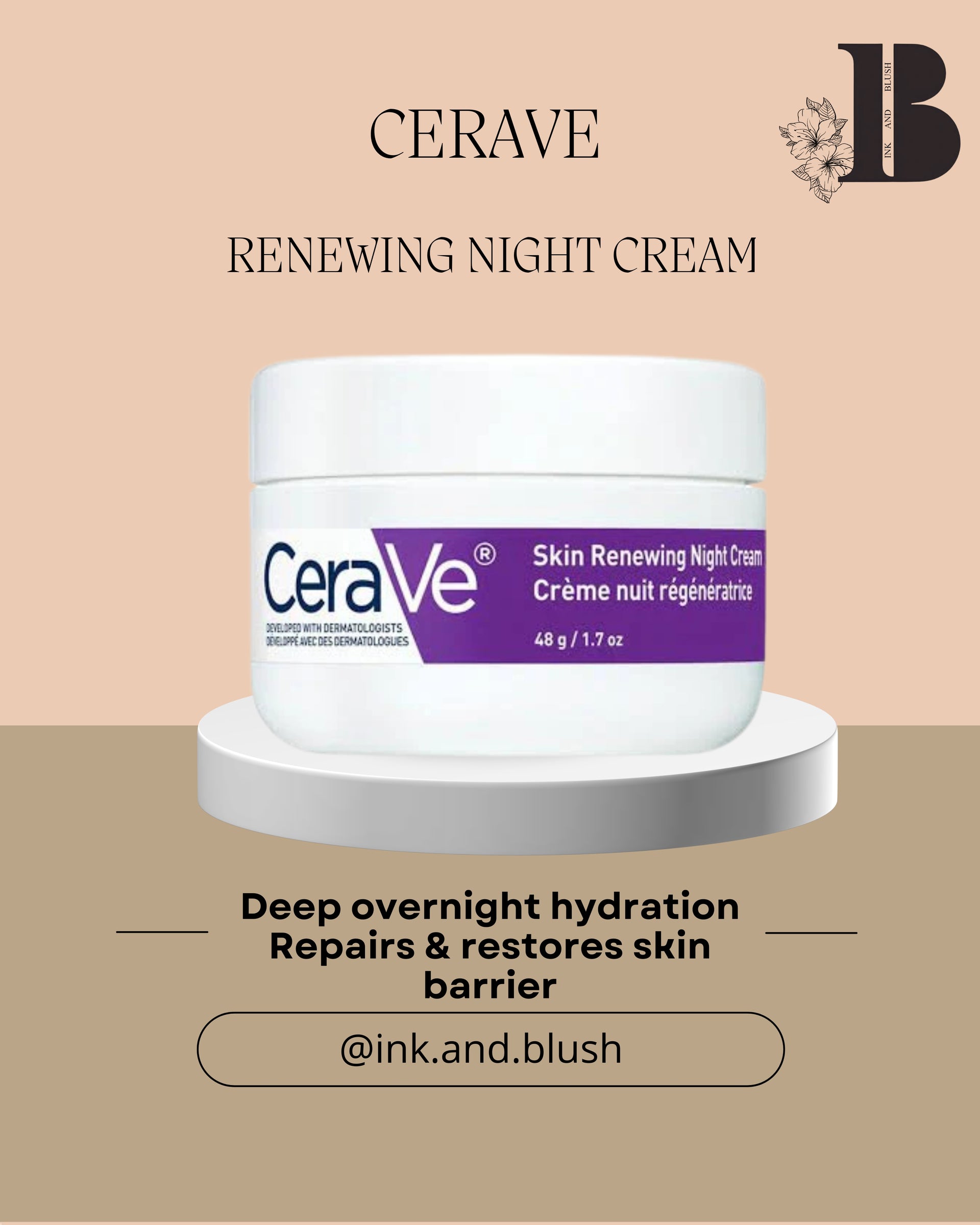CeraVe Skin Renewing Night Cream (48 g): A deeply nourishing night cream specially designed to work while you sleep. Infused with ceramides, peptides, niacinamide, and hyaluronic acid, it helps restore and strengthen the skin barrier, lock in moisture, and support the skin’s natural renewal process. Its rich yet non-greasy texture provides intense overnight hydration, leaving skin feeling smoother, firmer, and more refreshed by morning. Suitable for all skin types, including sensitive skin.