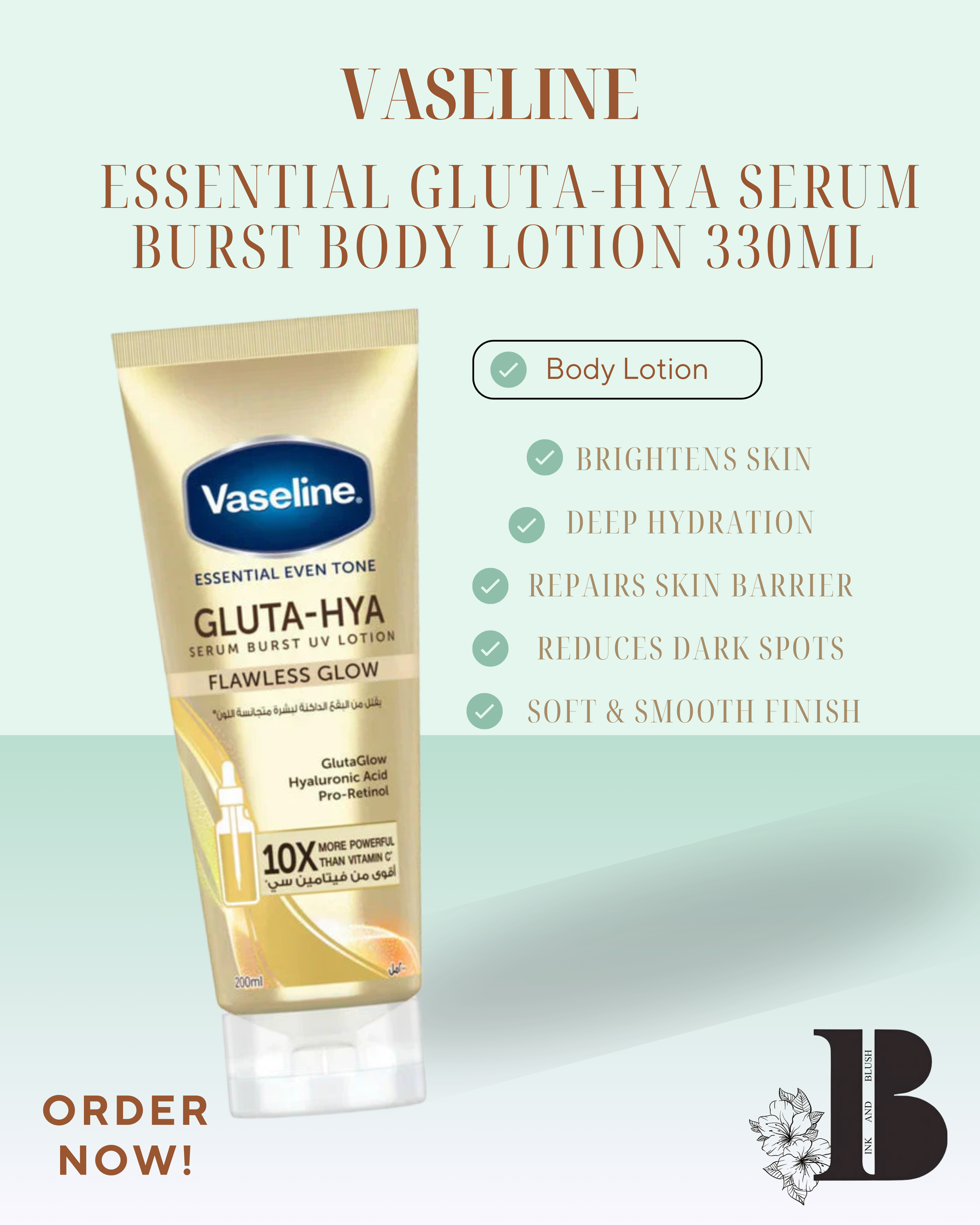 Reveal radiant, healthy-looking skin with Vaseline Essential Gluta-Hya Serum Burst Body Lotion. Infused with glutathione and hyaluronic acid, this lightweight formula deeply hydrates while brightening dull skin for a natural glow. Its serum-burst technology absorbs quickly without greasiness, leaving skin smooth, nourished, and luminous all day. Perfect for daily use to achieve soft, even-toned skin.